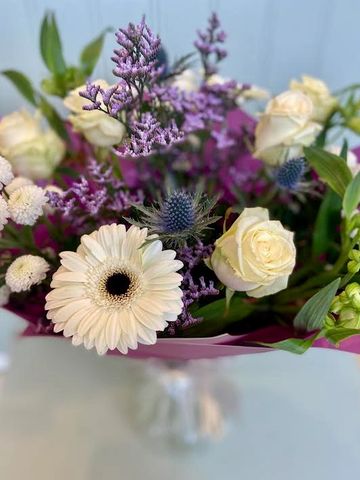 We select the best, seasonally available fresh hand-tied Ivory and Lilac flowers for this stunning bouquet.