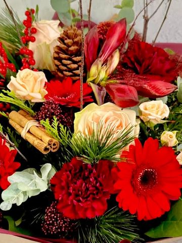 Our RED Merry Christmas Hand-Ties includes the very best Roses and season flowers.
